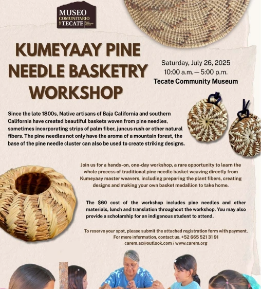 Join us for a hands-on, one-day workshop, a rare opportunity to learn the whole process of traditional pine needle basket weaving directly from Kumeyaay master weavers, including preparing the plant fibers, creating designs and making your own basket medallion to take home.