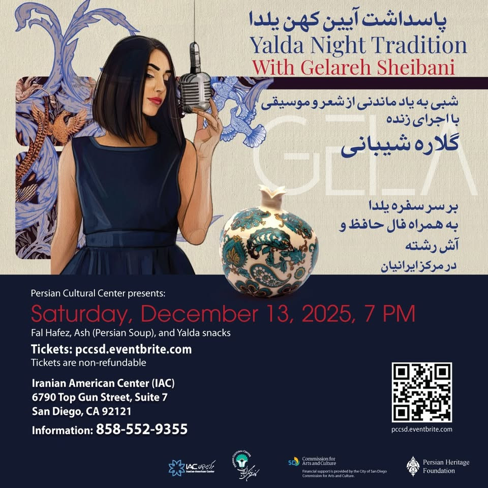 | 7:00 PM | Yalda Night With Gelareh Sheybani Saturday, December 13, 2025, 7 PM Fal Hafez, Ash (Persian Soup), and Yalda snacks