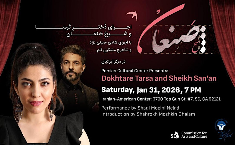 The performance of Faridoddin Attar's “Dokhtare Tarsa’s and Sheikh San‘an" from his "Conference of Birds" collection of stories, performed by Shadi Moeini Nejad with an introduction by Shahrokh Moshkin Ghalam. This play, adapted from the masterpiece "The Conference of the Birds," offers profound lessons on the meaning of true love, conveyed through simple yet symbolic language, and will be performed by Shadi Moeini Nejad.