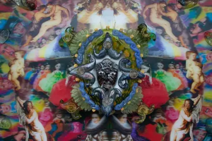 This perspective arises in the central work of the exhibition, Vodyanoy, which suffuses its title character (a creature of the swamps from slavic mythology that can care for people or drown them) with metaphors for a nature- deity serving an overdue bill for humanity’s excess. The results are shifting images of both utopian salvation and realistic warning, evidenced through the clean water flow brought on by meditative Sufi Whirling Dervishes. In the alternating image, a murky green swamp serves as the backdrop for Flemish renderings of the wounded and dead from futile wars. The De La Torre Brothers’ endless book of historical, cultural, religious, and artistic references are all compounded on and distilled in the moral storytelling which permeates their practice.