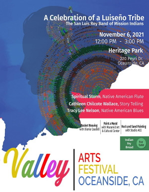 This free family-friendly festival will feature Native American flute music with Spiritual Storm, Native American blues music with Tracy Lee Nelson, Indian Fry Bread for purchase, educational tables filled with historic cultural items, and a variety of participatory family-friendly activities. These activities will include an interactive community mural sponsored by Muramid, with concept design by Linda Kallas and final execution by renowned Muramid artists, interactive basket weaving with Diania Caudell, a Luiseño member of the San Luis Rey Band of Mission Indians and Board Member of the California Indian Basket Weavers Association (CIBA), Native American story time with Oceanside Public Library, featuring storytelling by Cathleen Chilcote Wallace, native animal sand & rock painting with Studio ACE (with an opportunity for rocks that have been painted and gifted back to the festival to reside in the Peace Garden at Muramid in the future), and more to come!
