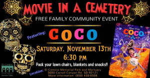 Join in for a free unique night out with your Family, Pets and Friends. Come CELEBRATE LIFE with us!! Enjoy a unique outdoor movie experience with a Dia De Los Muertos theme and free delicious concession snacks provided by El Camino Memorial. Pack your lawn chairs and blankets! Family and pet friendly (leashes please). *Movie start time is approximately 6:30 pm. Concession snacks provided while supplies last