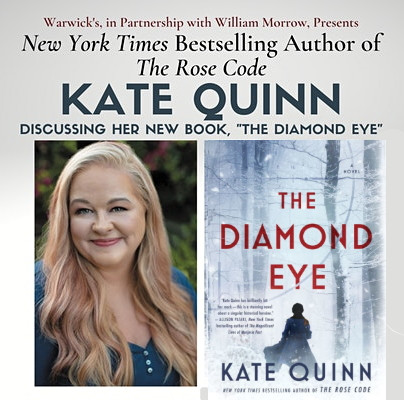 Warwick's will host Kate Quinn as she discusses her new book, The Diamond Eye. Kate Quinn is the New York Times and USA Today bestselling author of historical fiction. a native of Southern California, she attended Boston University, where she earned bachelor's and master's degrees in classical voice. a lifelong history buff, she has written four novels in the Empress of Rome Saga and two books set in the Italian Renaissance before turning to the 20th century with the Alice Network, the Huntress and the Rose Code. All have been translated into multiple languages.