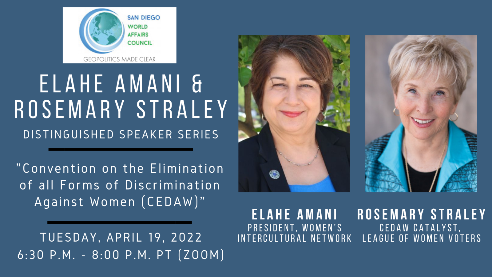 Elahe Amani, president of the Women’s Intercultural Network (WIN) which guides Cities For CEDAW, will explain the provisions of CEDAW and describe the global context in which it operates. Rosemary Straley, who leads the CEDAW working group composed of representatives from community organizations mobilized by League of Women Voters, will brief us about San Diego.