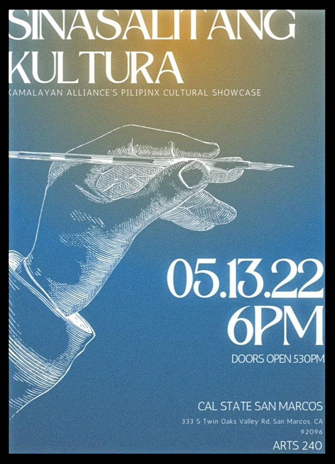 "Sinasalitang Kultura" is presented by CSUSM's Kamalayan Alliance. JP Aquino-Villanueva moves in with his mother, Irene, after spending a good portion of his life being raised by his grandmother, Serena. After his father's death occurred when he was younger, JP's relationship with his mother only grew to be more distant and estranged As JP tries to fit in at a new school, he discovers that they have a spoken word club known as "SinKu". Here, he finds new friends and is given the opportunity to write about his experience with his mother and growing up as a Filipino-American.