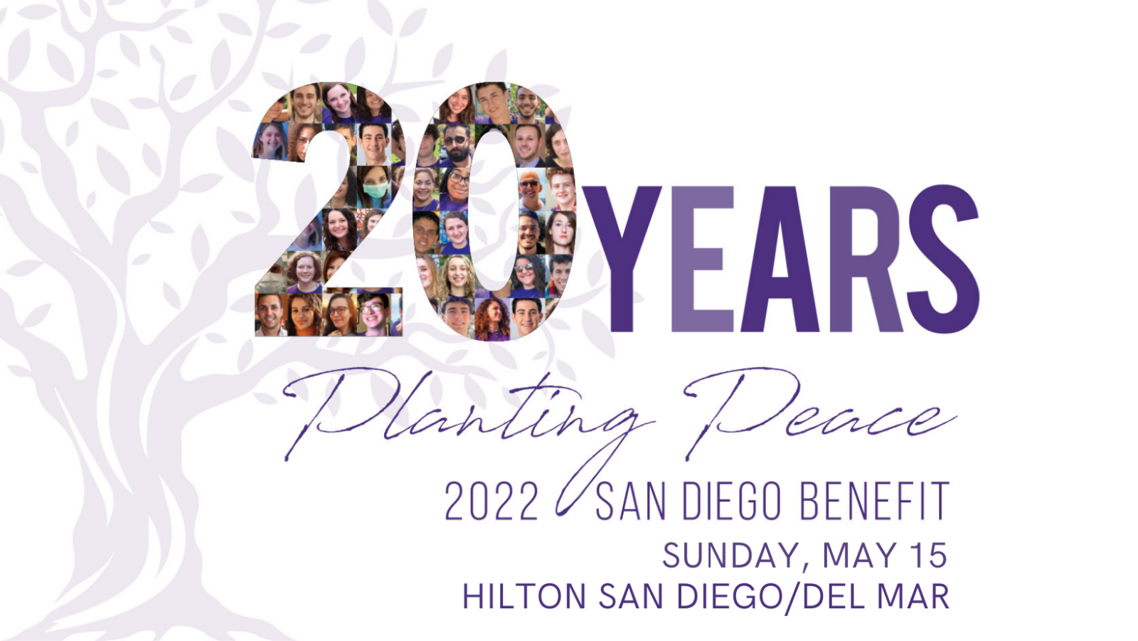 As we plan to look back at "20 Years Planting Peace" and look forward to the work still ahead, we are moving the San Diego Benefit entirely outside to the beautiful poolside patio at the Hilton San Diego/Del Mar on Sunday, May 15 at 5:30 pm. When you present proof of COVID vaccination at registration you will be given a purple Hands of Peace bracelet.