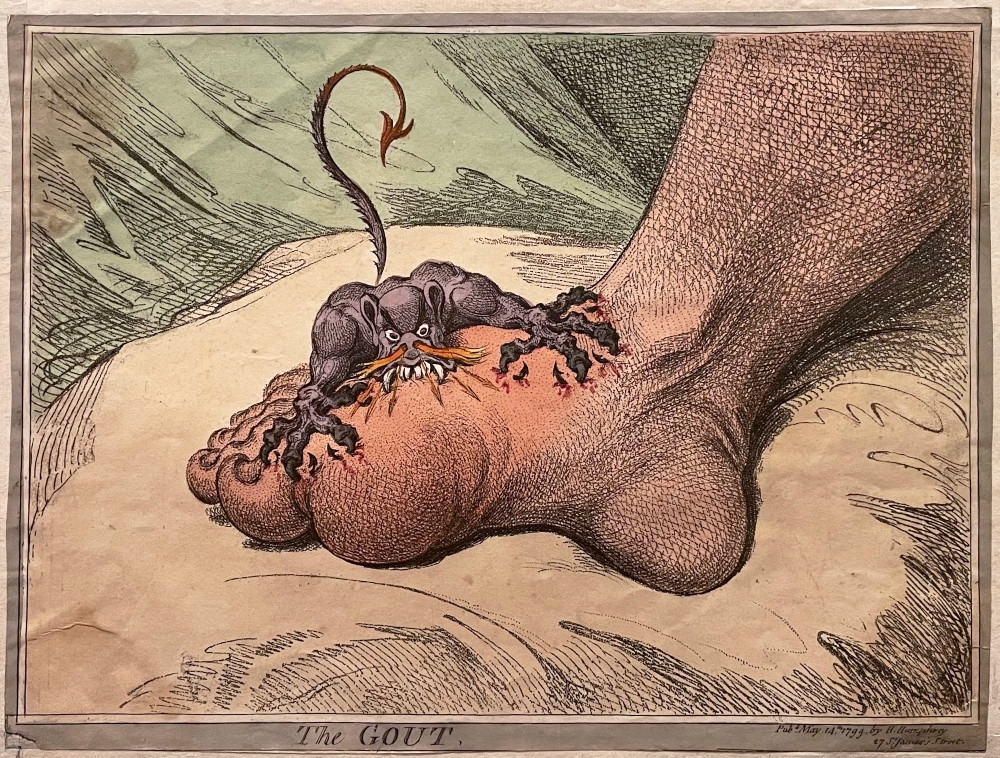 This exhibition, centered principally on the work of James Gillray (1756-1815), explores how the grotesque imagination of 18th century satirists interrogated the apparently distinct realms of physical pain and revolutionary politics. Caricatures of the diametrically opposed political thinkers Edmund Burke and Thomas Paine are presented alongside images of that event about which they most fervently disagreed: the French Revolution and its aftermath. And hovering above it all is Gillray’s horrific representation of the body in pain: “The Gout."