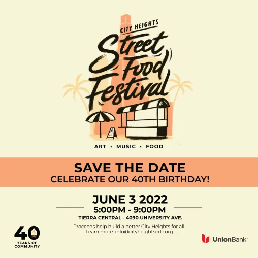 The second annual City Heights Street Food Fest will be an evening of live art, music, drinks, community, and street food as diverse as City Heights! Join us June 3rd to celebrate the City Heights community and the City Heights CDC's 40th birthday.