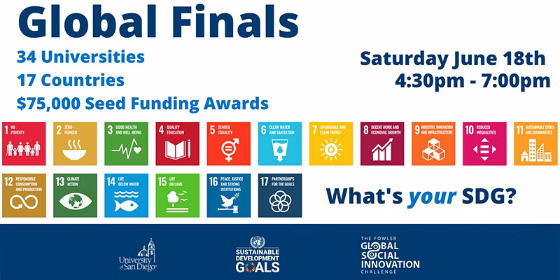 Join the Joan B. Kroc Institute for Peace and Justice to cheer on the Global Finalists as they compete for $75,000 in seed funding and showcase their world-changing social enterprise ideas. All of the participants in the Global Finals placed in the top two teams at their respective universities. This year's competition includes universities from 34 global universities, representing 17 countries!
