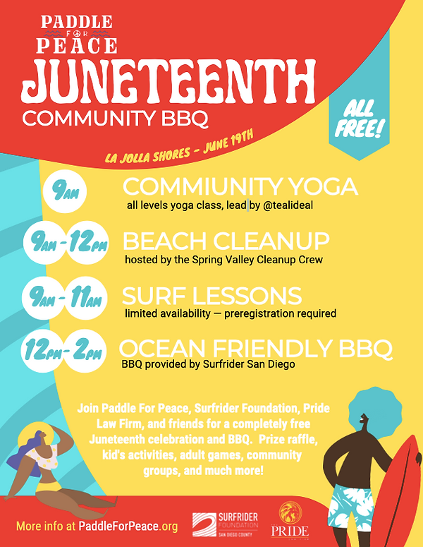 Paddle for Peace's second annual Juneteenth BBQ will be held at La Jolla Shores. We will offer free surf lessons for the BIPOC community and free yoga followed by a BBQ. We will have activities for the kids, an interactive Photo Booth and games for adults and much more.