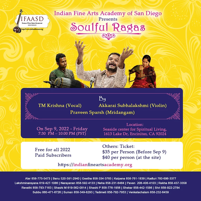 An eminent and leading musician of today - T.M.Krishna in concert with Akkarai Subhalakshmi on Violin and Praveen Sparsh on Mridangam.