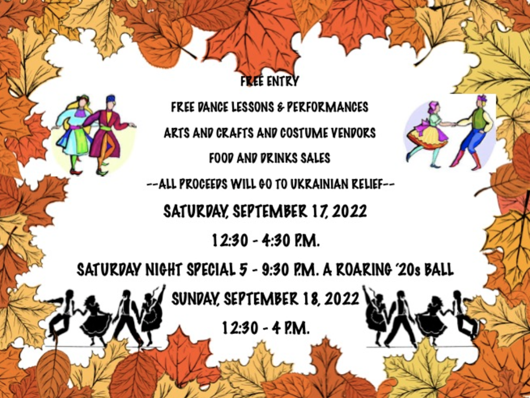 5:30 – 9:30 p.m. A Roaring 20’s Party ($5 entry fee donated to the House of Ukraine for Ukrainian Relief efforts)