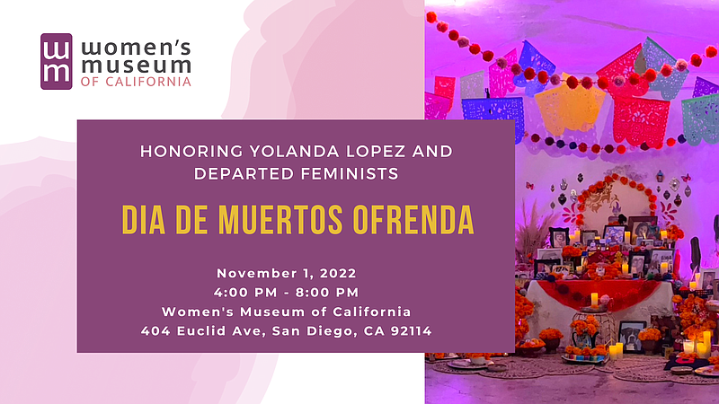 Celebrate Dia de Muertos with the Women’s Museum of California. Join WMC Artistic Director Katie Ruiz in decorating a feminist altar honoring Yolanda Lopez and other trailblazing women. Yolanda López, an artist and activist who created one of the most famous artworks in Chicano history by boldly recasting the Virgin of Guadalupe in her own image — as a young, strong, brown woman wearing running shoes and a wide grin. Members of the public are encouraged to bring a photo of a feminist who has passed away (ie: RBG, Artemisia Gentileschi, Miriam Shapiro, Ida B. Wells) and come decorate a frame for the photo. Enjoy an evening of crafts and community for all ages. Typically, Dia de Muertos is a Mexican holiday that honors those who have passed. Creating an altar (ofrenda) is believed to help the souls come through to visit us for one night. Atole (corn) beverage available to enjoy.