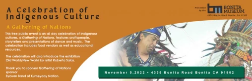 This free public event is an all day celebration of indigenous cultures, a Gathering of Nations, features craftspeople, storytellers and presentations of dance and music. The celebration includes food vendors as well as arts and crafts activities. The event takes place on land near ancient Kumeyaay village sites and allows for education about current Kumeyaay events in the region and at the Kumeyaay College. This public event is free and held both outside at the Greg Cox Civic Complex in Bonita as well as inside the Bonita Museum & Cultural Center and inside the community room at the Bonita-Sunnyside Library. The celebration will also introduce exhibition Old World/New World by artist Roberto Salas. Salas has worked with native voices and storytellers from around the world. He is inviting them to the event for a memorable gathering. Honored guests include local Kumeyaay educators. Thank you to sponsor Sycuan Band of Kumeyaay Nation.