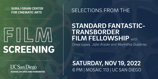 The Suraj Israni Center for Cinematic Arts is pleased to invite you to the screening of Transborder Film Fellowship with Omar Lopex, Jafet Arzate, and Marinthia Gutierrez on Saturday, November 19, 2022 at 6 p.m. at the Mosaic 113 Auditorium in the North Torrey Pines Living and Learning Neighborhood.
