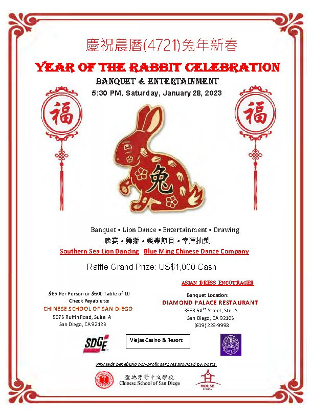 Join the House of China at the Diamond Palace Restaurant for an banquet and entertainment celebrating the Year of the Rabbit. See flyer for cost and ticket information.