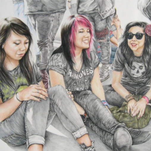 Saldamando's work functions as celebration and homage to peers and loved ones. Her mother’s family is Japanese American, by way of Boyle Heights/Sawtelle areas of L.A., and a survivor of the Japanese American Internment camps. Her father is Chicano (Mexican American) from Nogales, AZ.
