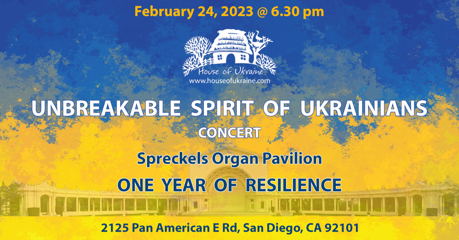 Unbreakable Spirit of Ukrainians Concert will commemorate one year of Ukrainian resistance against Russian full scale invasion at 6:30 pm on the 24th of February at Spreckels Organ Pavilion.