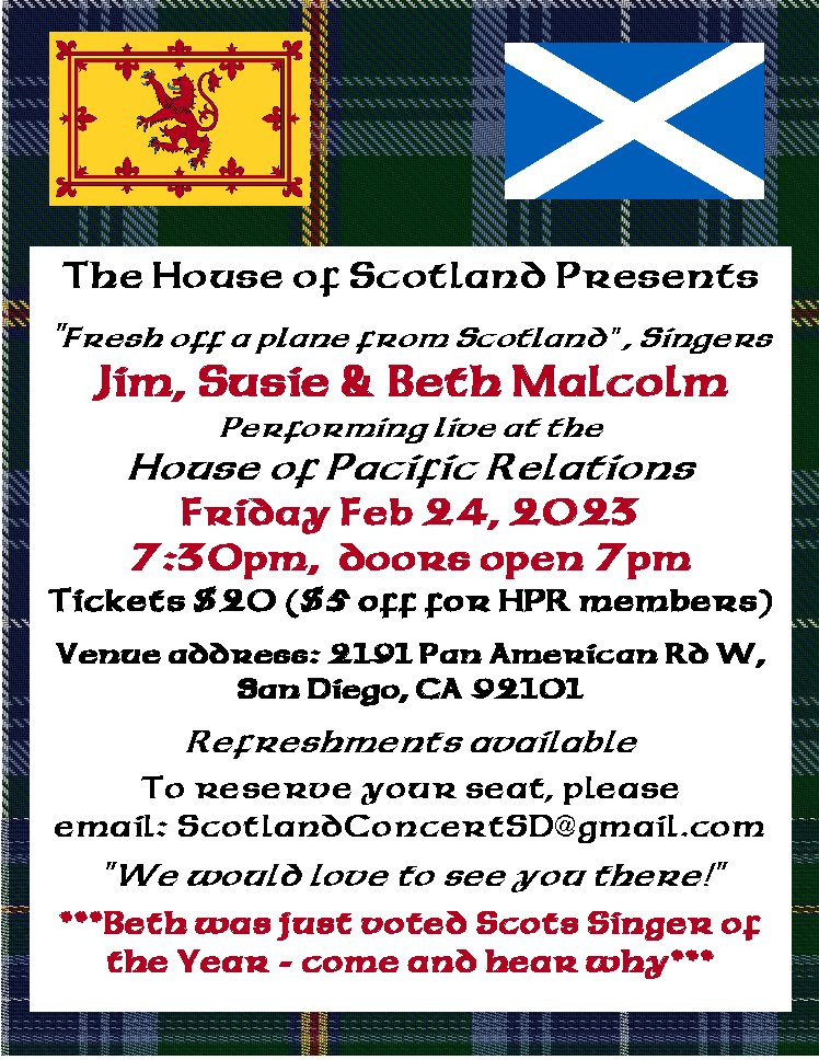 House of Scotland presents singers Jim, Susie and Beth Malcolm. Doors open at 7 p.m. Refreshments available.