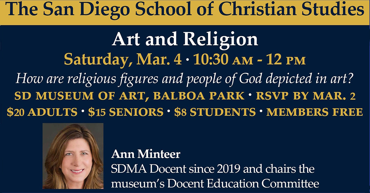 This SDMA docent-led tour and discussion will focus on how religious figures and people of God are depicted in art and how these depictions change due to historical and cultural influences. the tour will focus on the Christian and Muslim faiths.