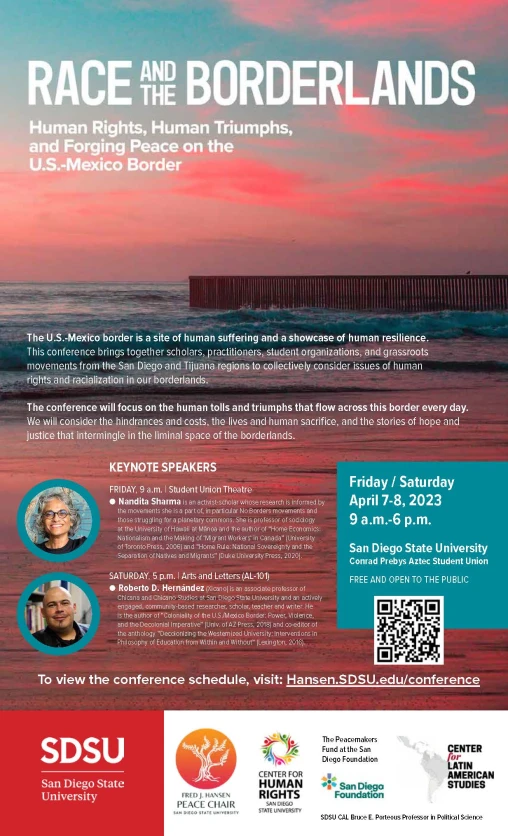 Race and the Borderlands is a conference hosted by the Fred J. Hansen Peace Chair and the Center for Human Rights at SDSU that brings together scholars, practitioners, student organizations, and grassroots organizations from the San Diego and Tijuana regions to collectively consider issues of human rights and racialization in our borderlands. The conference will focus on the human tolls and triumphs that flow across this border every day. We will consider the hindrances and costs, the lives and human sacrifice, and the stories of hope and justice that intermingle in the liminal space of the borderlands. This binational conference will focus on scholarly collaboration, community building, and movement of ideas and people in the region. Keynote speakers are Nandita Sharma (9 A.M. in Conrad Prebys Union Theatre, April 7) and Roberto D. Hernández (5 P.M. AL 101, April 8)