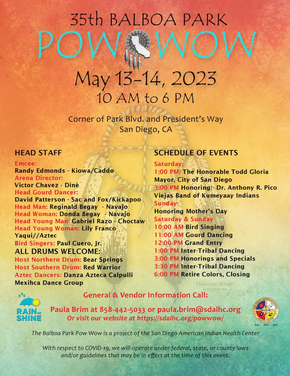 The San Diego American Indian Health Center (SDAIHC) will host the 35th annual Balboa Park Pow Wow, a celebration and showcase of Native American culture and traditions. Native singers, drummers, and dancers in their beautiful regalia from throughout the Southwest will gather in Balboa Park to practice their traditions.