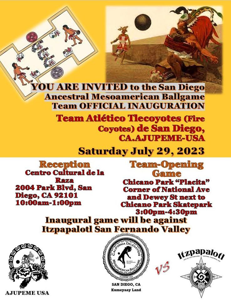 Witness the birth of San Diego's official team of the ancestral mesoamerican ballgame known as Ulamaliztli and Pok-Ta-Pok. The team will form part of its international league, AJUPEME (Asociacion de Juego de Pelota Mesoamericano) under the USA and California Delegations. The event will be blessed by danzantes and will include speeches, a press conference, and lunch to be served.