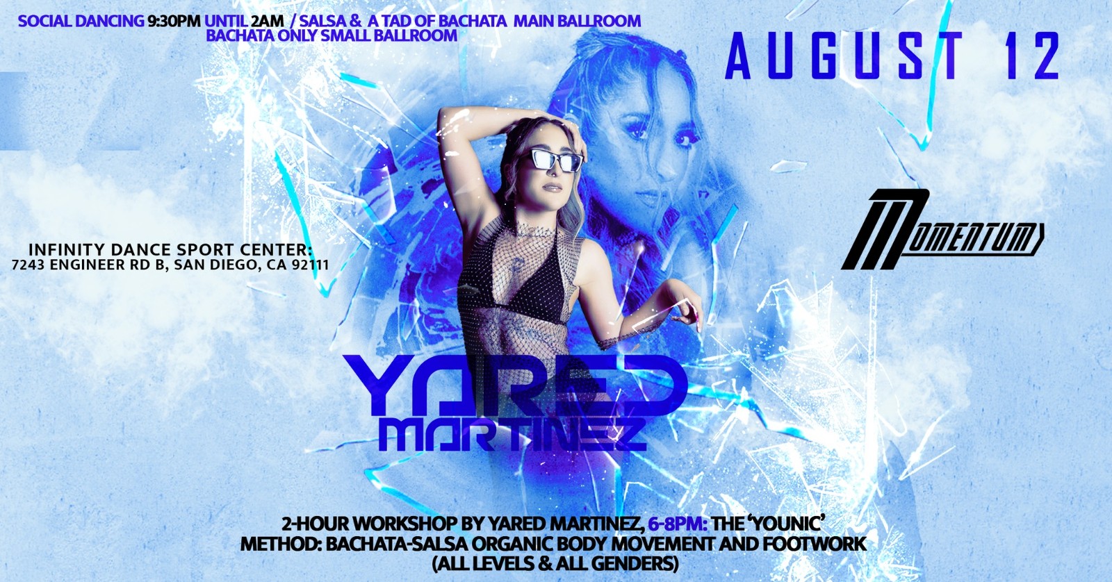 A very “Younic” Edition of the Momentum Salsa/Bachata social. Featuring international latin dance artist & multi-time world champion Yared Martinez and her Younic Dance Company, teaching, performing & social dancing.