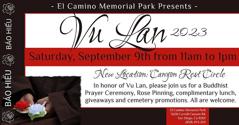 In honor of Vu Lan, join a Buddhist Prayer Ceremony, rose pinning, complimentary lunch, giveaways and cemetery promotions. All are welcome. In the Vietnamese culture, Vu Lan or Wandering Souls Day is the equivalent of Mother’s Day. There are many traditions honored on this day, including pin roses, incense and joss paper for such occasions. Complimentary vegetarian lunch will be provided while supplies last.