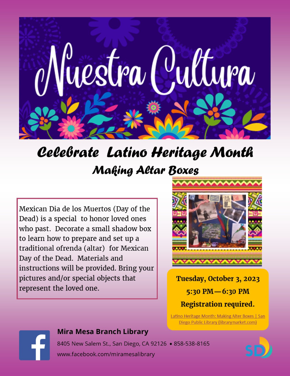 Mexican Dia de Los Muertos (Day of the Dead) is a special to honor loved ones who past. Decorate a small shadow box to learn how to prepare and set up a traditional ofrenda (altar) for Mexican Day of the Dead. Materials and instructions will be provided. Bring your pictures and/or special objects that represent the loved one.
