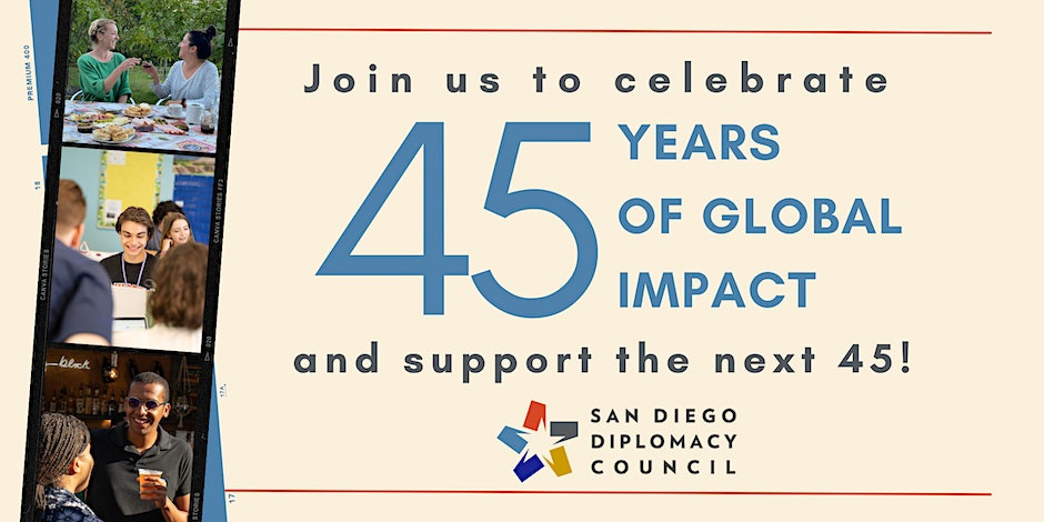 The San Diego Diplomacy Council is excited and proud to honor our 45th anniversary this year! From our small beginnings as a volunteer run organization in 1979, to becoming a nationally-recognized organization focused on connecting San Diego to the world, we are proud of our past and excited about our future. None of our growth or impact could have been realized without the support of you, our San Diego community. Please join us to celebrate the impact of 45 years, learn about our aspirations, and support our next 45 years!