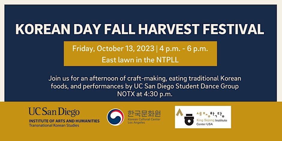 Come join us at the Korean Fall Harvest Festival! This exciting event will be held at Sixth College, Gilman Drive, La Jolla, CA, USA. Get ready to immerse yourself in the vibrant Korean culture and celebrate the bountiful harvest season. Indulge in delicious Korean cuisine, experience traditional music and dance performances, and participate in fun activities for all ages. Whether you're a K-pop fan or simply curious about Korean traditions, this festival promises a memorable day filled with joy and excitement. Mark your calendars and join us for a day of Korean festivities!
