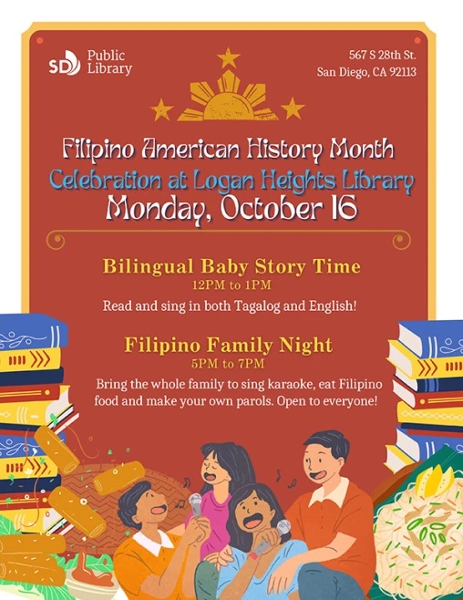 Stop by the Logan Heights Branch Library to celebrate Filipino American History Month! We will have fun family programs throughout the day.