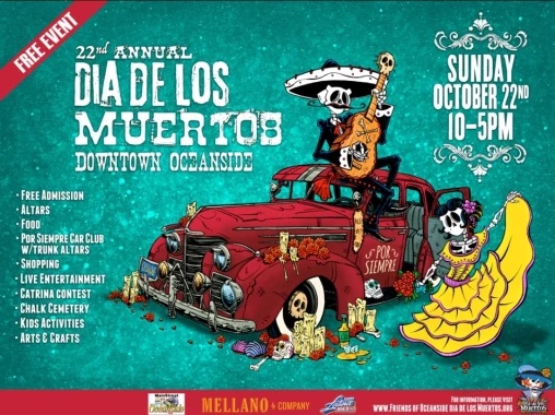 This year's festival will continue with its many community partners to continue the largest attended Dia de los Muertos Festival in Downtown Oceanside. This vibrant event will showcase altars, traditional dancers, Classic Car Show, a shopping Mercado, a family friendly event. This event is FREE, No tickets needed.