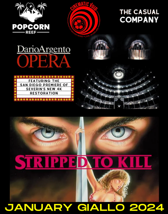 Popcorn Reef and The Tenth Avenue Arts Center are bringing Cinematic Void and January Giallo founder Jim Branscome down to San Diego to discuss the Italian horror subgenre. They will be screening a double feature of Giallo films, including the San Diego premiere of the new 4K restoration of Dario Argento's OPERA, and the American Giallo STRIPPED TO KILL. Severin Films will also be in the house with rare blu-ray releases for sale before the show.