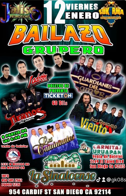 A variety of different bands, including banda, norteño, and grupera will perform including: Grupo Ladrón, Los Guardianes Del Amor, Viento Y Sol and Los Tiranos Del Norte.