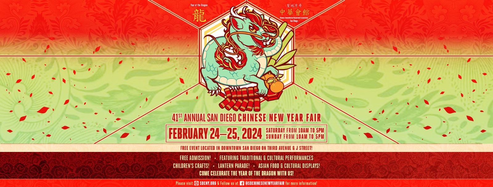 The 41st Annual San Diego Chinese New Year Fair RETURNS on Saturday, February 24, and Sunday, February 25! Celebrate the Year of the Dragon with old and new friends on the corner of 3rd Avenue and J Street in downtown San Diego! The fair will go on, RAIN OR SHINE! We will have traditional and cultural entertainment all day long on both days, LION DANCES, kung fu, traditional instruments, classical dance troupes, and so much more, so don't miss out! Food, family-friendly entertainment, crafts for kids, a dragon dance, vendors, and so much more fun than you can expect! This event is FREE to the public!This fun, family event is hosted and presented by the Chinese Consolidated Benevolent Association - San Diego! The San Diego Chinese New Year Fair tradition was started by the descendants of the San Diego Chinese community that resided in downtown San Diego since the late 1880s. Today, we feast and play in the same historic neighborhood with diverse food, cultural performances, and craft vendors!