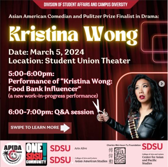 Asian American Comedian and Pulitzer Prize Finalist in Drama, Kristina Wong will be performing her new show, "Kristina Wong: Food Bank Influencer" and engaging in a Q & A.