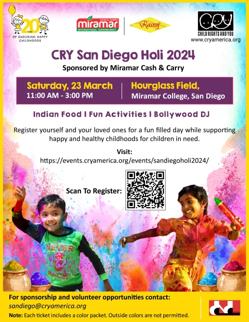 Join us for an extraordinary HOLI celebration presented by CRY America - San Diego Action Center! Immerse yourself in the vibrant beats, colorful tapestry of diverse cultures, and a joyous atmosphere.