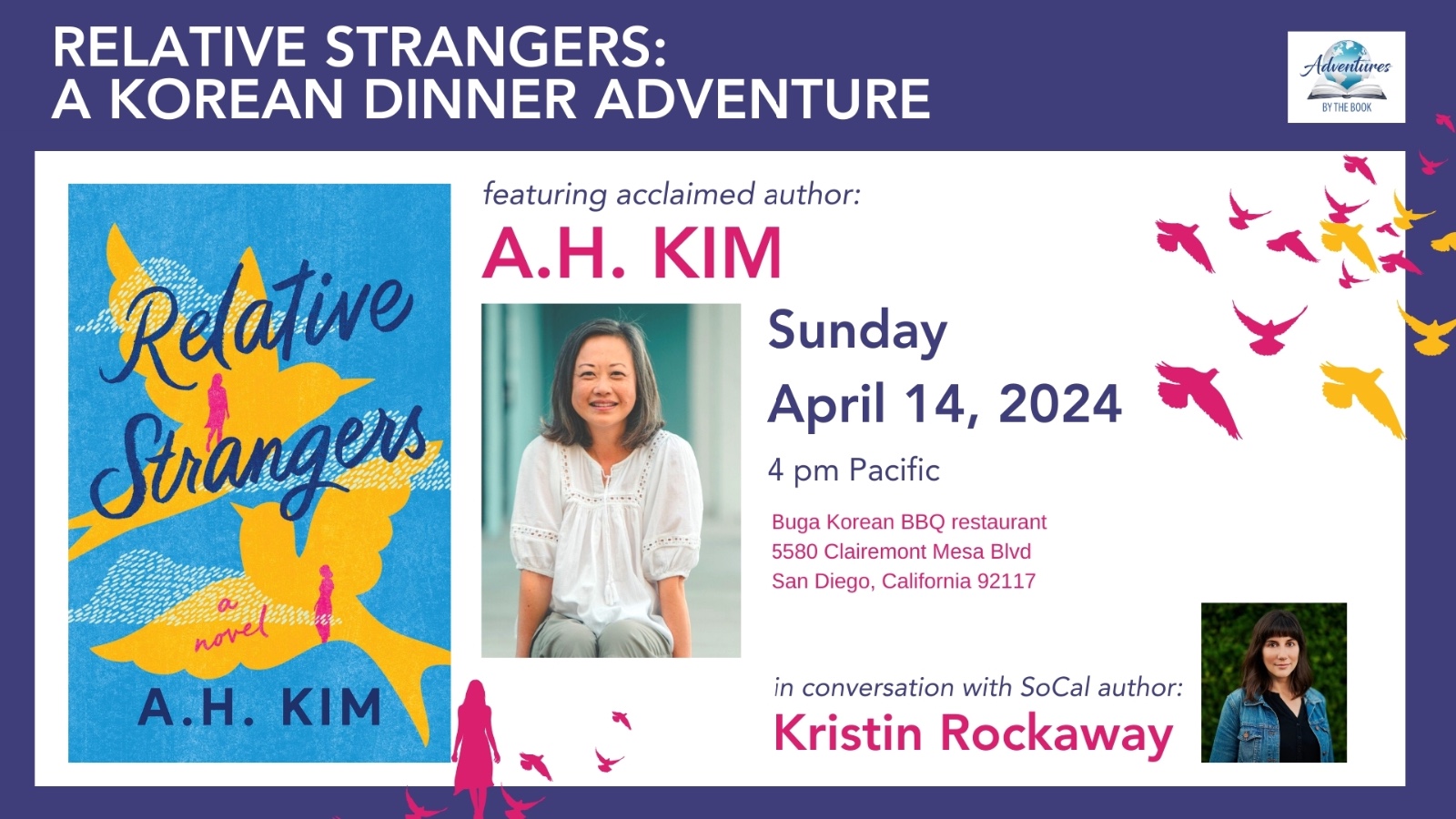 Let’s take a moment in time to meet acclaimed author A.H. Kim, in conversation with SoCal author Kristin Rockaway, in this Korean Dinner Adventure to celebrate Ann’s new book, Relative Strangers, a timely spin on Sense and Sensibility, a twenty-first-century family drama featuring two half-Korean sisters, their ex-hippie mother, multiple messy love affairs and one explosive secret that could ruin everything. Join us at Buga Korean BBQ for an authentic and delicious dinner and a lively book discussion! Experience the exquisite tastes of Korean cuisine and learn all about A.H’s witty and entertaining retelling and how it explores love, loss, grief, and forgiveness through the perspectives of two sisters. Your Adventure includes dinner, soft beverage, tax, gratuity, and an opportunity to meet the authors up close and personal in an intimate setting! Pre-order your book below to be delivered to the event for signing. Copies will also be available at the event for purchase and signing.