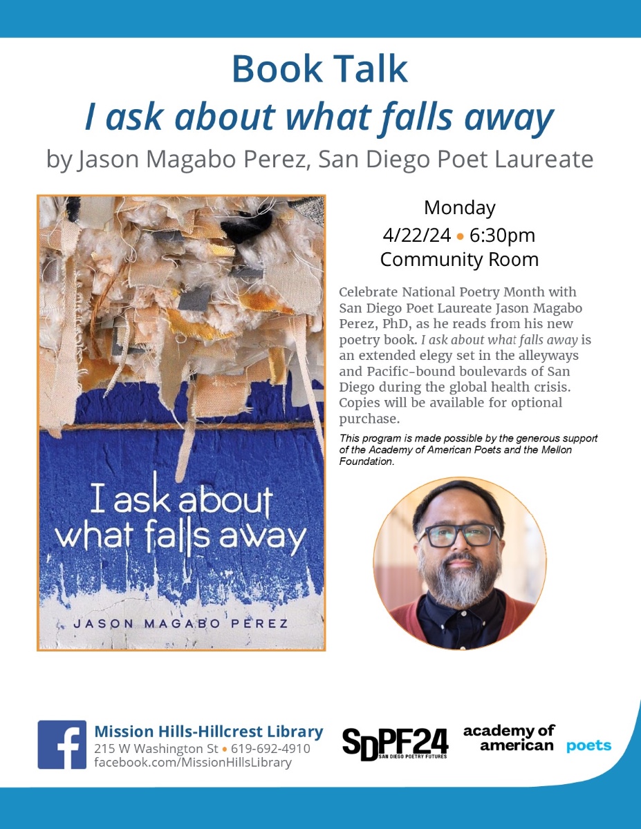 Celebrate National Poetry Month with San Diego Poet Laureate Jason Magabo Perez, PhD, as he reads from his new poetry book. I ask about what falls away is an extended elegy set in the alleyways and Pacific-bound boulevards of San Diego during the global health crisis. Copies will be available for optional purchase. This program is made possible by the generous support of the Academy of American Poets and the Mellon Foundation.
