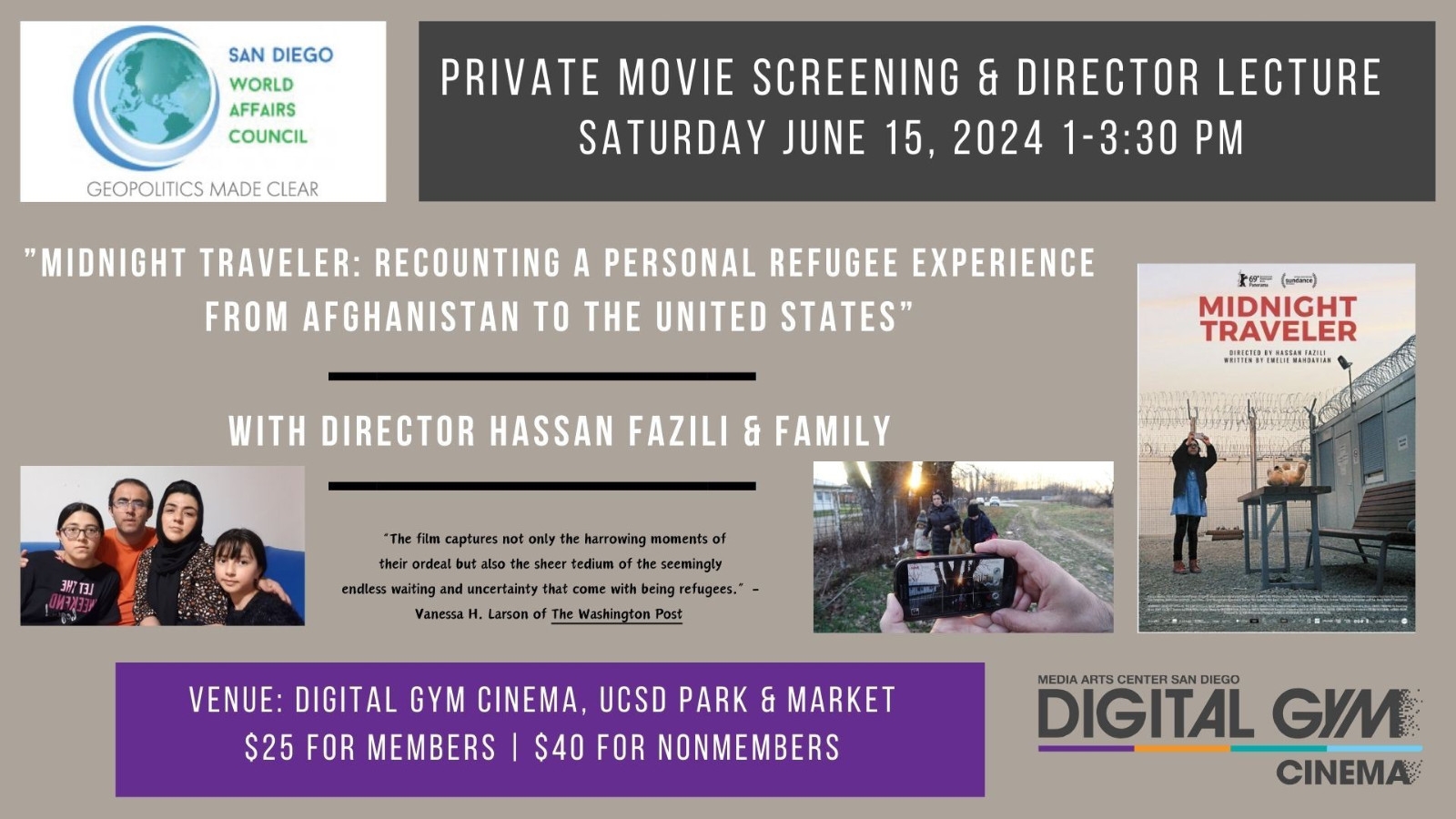 Join the San Diego World Affairs Council for this exclusive movie screening and an opportunity to meet & greet the Director, Hassan Fazili, and his family while they discuss their harrowing refugee journey from Afghanistan to the United States.