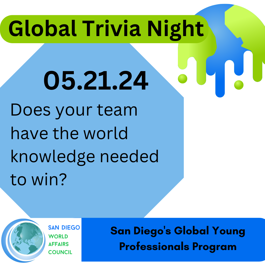 SDWAC's Young Professionals (YP) Program tailors dynamic and enlightening events for World Affairs Council members in their 20s and 30s. YP members come from all professions and backgrounds but share a common interest in international topics – business, culture, politics, economics, and current events. The San Diego World Affairs Council is dedicated to educating and engaging a generation of future leaders who are interested in supporting international opportunities in the San Diego area. SDWAC's feature YP networking event is "Global Trivia Night" where we offer a fun opportunity for trivia teams of 3-5 individuals to compete for the title of "San Diego's World Knowledge Champions" during a fast-paced, competitive tournament of trivia focused on global topics including rounds on topics such as world history, current international news and global politics.