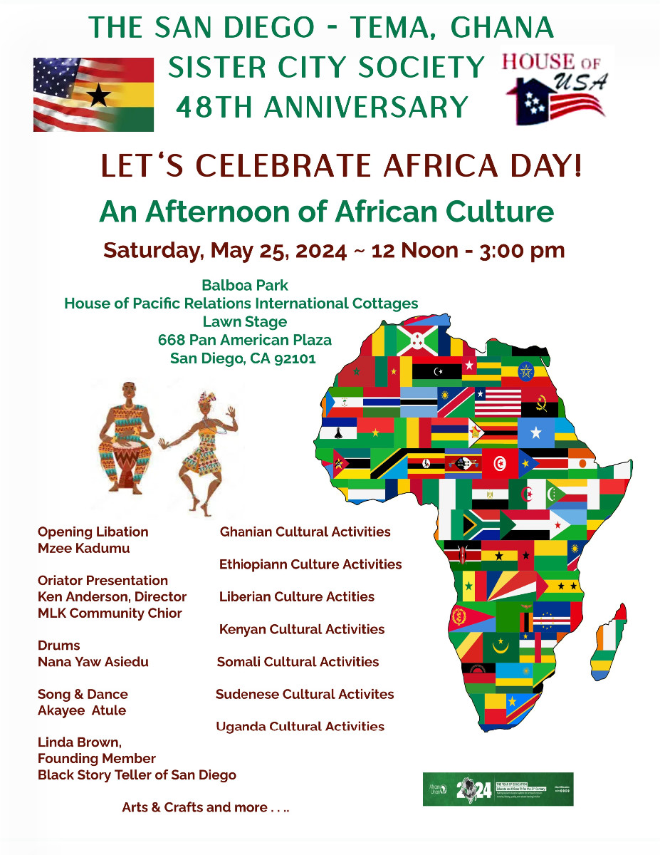 Let's Celebrate Africa Day with an Afternoon of African Culture. Ghana, Ethiopian, Liberian, Kenyan, Somali, Sundenese, and Ugandan activities. Featuring an opening oration by Mzee Kadumu, Oration by Ken Anderson, Drums by Nana Yaw Asiedu, story-telling with Linda Brown, and Arts and Crafts.