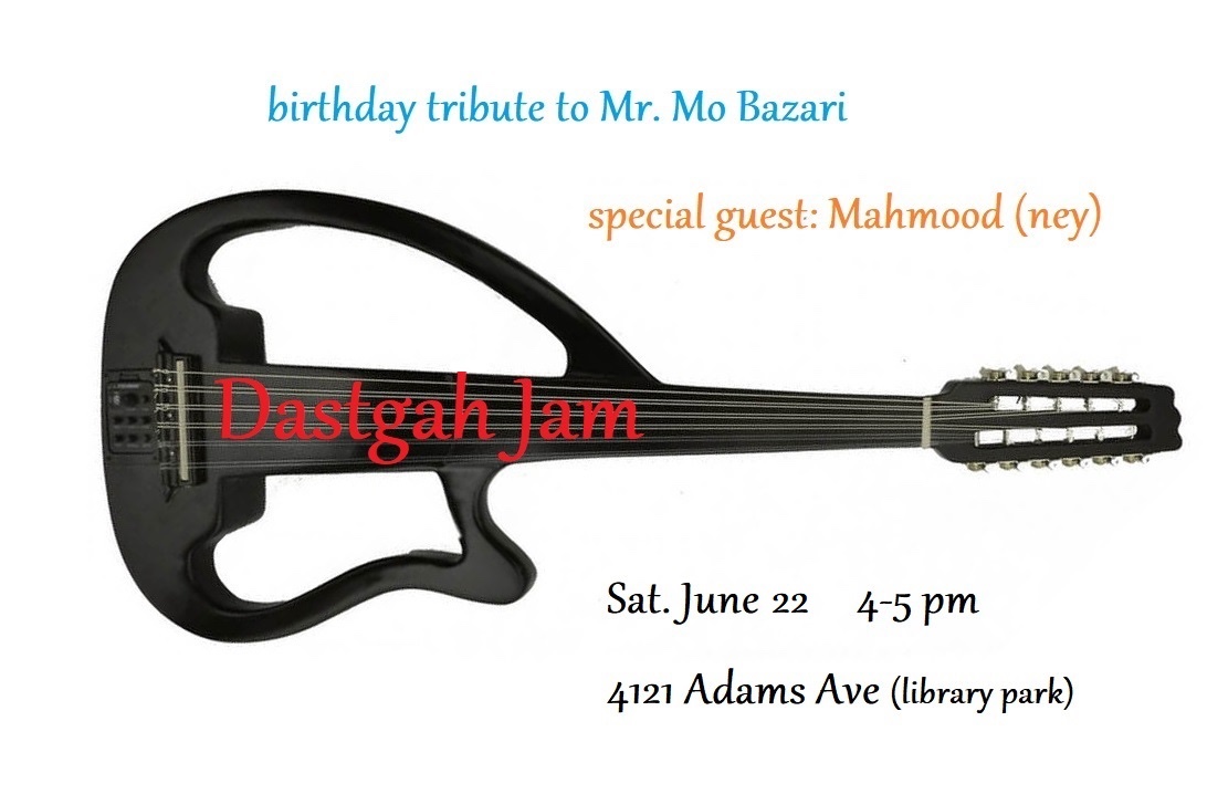 Persian Music in the Spirit of Jazz Outside the library on Adams Ave. Bring a lawn chair and good ears. Or bring an instrument and sit in!Each time with a special guest, the monthly outdoor series presented by the Friends of Kensington Library, features chromodal music friendly to both Western and Middle Eastern ears. Bring your instrument (and amp - we have AC power). Setlist available upon request.