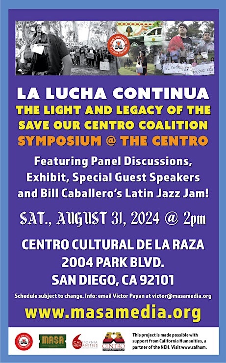 Join us for a symposium commemorating 25th Anniversary of the Save Our Centro Coalition's (SOCC) historic boycott of San Diego's Centro Cultural de la Raza (1999-2007), a communitywide response to a hostile Board takeover that included the disenfranchisement and expulsion of artists. This project will create virtual and in-person public discussions about the SOCC movement and vision, digitize archival material and conduct video interviews demonstrating SOCC members transformative impact in California and beyond. This project will create a lasting chronicle and perspective of this important movement for study and posterity via new conversations and a project website.