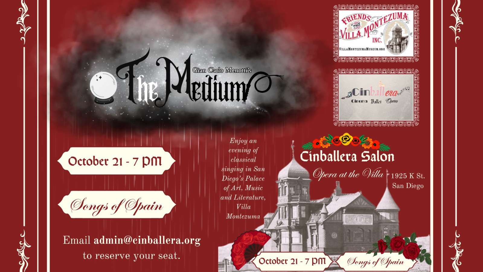 Instead of the usual evening of assorted songs, the next Cinballera Salon will feature a performance of a chamber opera, Gian Carlo Menotti's "The Medium." The second half of the program will be like our usual Salons, with the theme "Songs of Spain" in honor of Dia de los Muertos and All Hallows Eve.