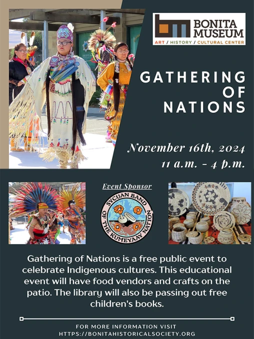 All are invited to the Gathering of Nations, an annual event that celebrates indigenous culture and features crafts, food, storytelling, and educational resources. The gathering is held on traditional Kumeyaay lands in the Sweetwater Valley at the Bonita Museum & Cultural Center and the Bonita Sunnyside SD County Library. The gathering highlights craftspeople, storytellers, food and educational resources. The events are free and open to the public.