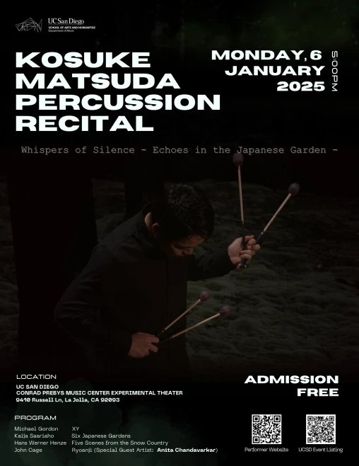 Kosuke Matsuda will present his solo recital at the Conrad Prebys Music Center Experimental Theater. This recital marks a significant milestone for Matsuda as it concludes his Doctor of Musical Arts degree and launches his 2025 season as a music performer.