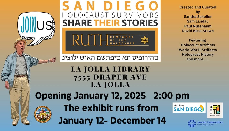 Come join us as we open the RUTH Remember Us The Holocaust exhibit in the La Jolla Library.